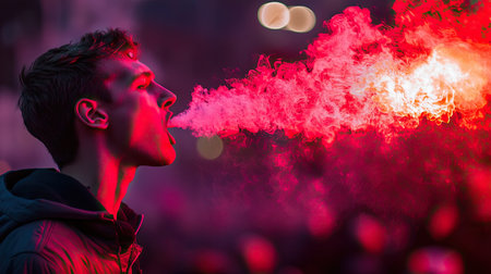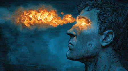 Abstract portrait featuring a face surrounded by fire and smoke elements, creating a dramatic and artistic visual. Ideal for abstract art, fantasy, and expressive themes.