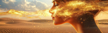 A woman with a serene expression glows vibrantly as golden particles surround her in a surreal manner. The background features expansive sandy dunes illuminated by a warm sunset.