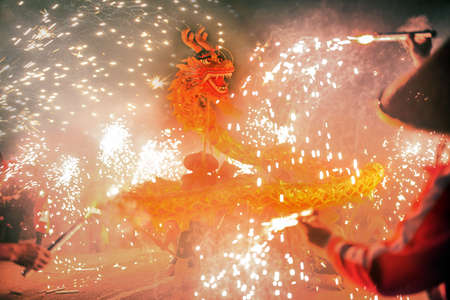 Firecracker display captured in a dramatic nighttime scene with a cascade of bright sparks and fire light during the celebration.