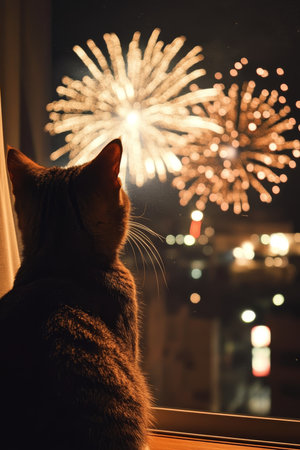 A cute cat gazes out the window, completely mesmerized by the colorful fireworks that are brilliantly illuminating the night sky, creating a serene yet festive and magical atmosphere all around