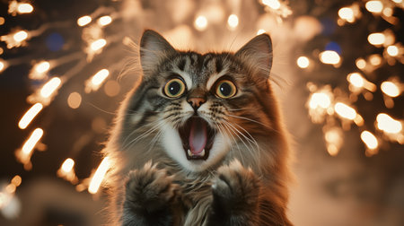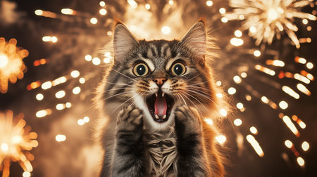Excited cat surrounded by colorful fireworks in a nighttime celebration