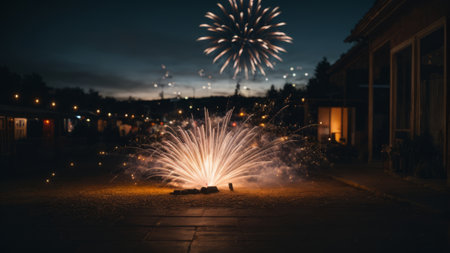 A firework display with lots of sparks and a blurry background. Concept of excitement and energy, as the fireworks light up the sky and create a dazzling display of colors and patterns