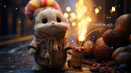 A kitten holds a firecracker with sparks. Space for text