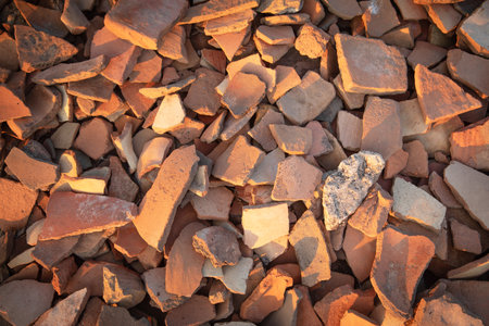 Stunning broken pottery shards arranged in a horizontal layout, ideal for textured overlays and artistic projects. Perfect for high-quality advertising.