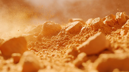 This close-up image showcases vibrant orange dust and rocks in a natural environment, capturing textures and dynamic movement in a striking landscape.
