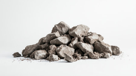 Crushed rocks and dirt form a rugged pile on a clean white background, showcasing rough industrial material.