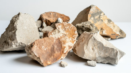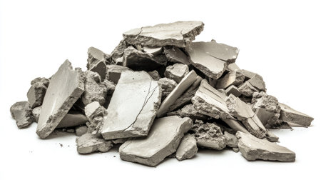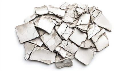 A captivating arrangement of broken plaster pieces displaying various shapes and textures, suitable for creative projects, design applications, or renovations emphasizing modern aesthetics.