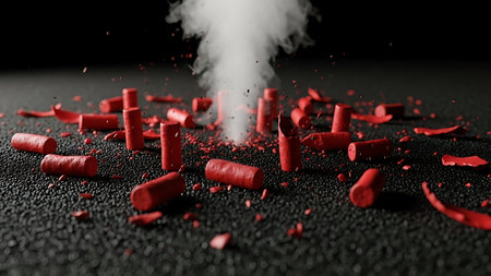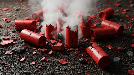 Close-up view of used red firecracker casings and paper strips lying on a dusty, textured surface, suggesting a recent event.