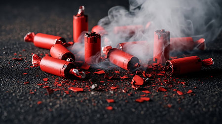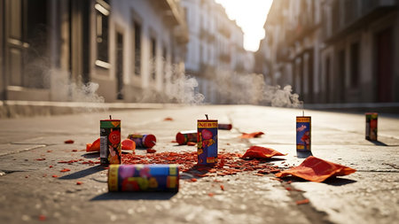 Vibrant red fireworks scattered on the ground, still smoking after Chinese New Year celebration in China