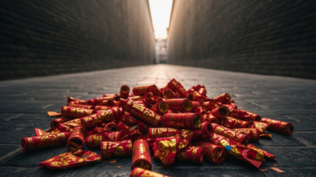 A dramatic scene capturing the essence of chinese new year celebrations in china with red firecrackers exploding.