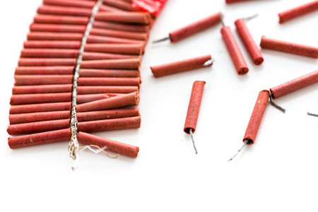 Red fire crackers string isolated over white background. Festival or celebration decoration equipment