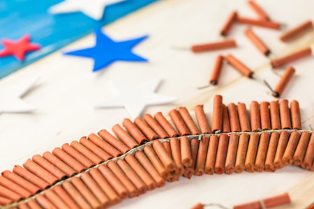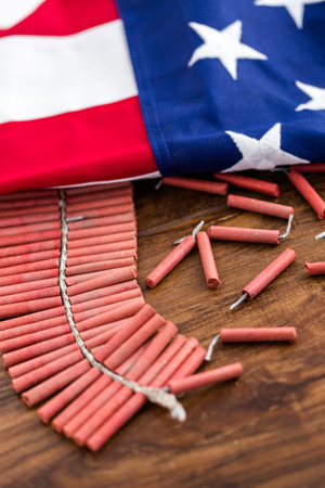 Roll of firecrackers with folded American flag.