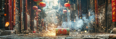 Firecrackers on Old Chinese Streets, Happy China New Year Festival, Holiday in Retro Chinese Streets Generative AI Illustration
