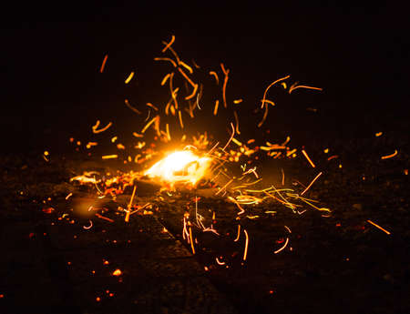 Burning sparkler on the ground with sparks flying in the air