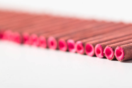 A decorative string of firecrackers unfurled in perfect alignment, placed against a clean white surface