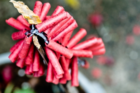 Unlit, decorative Chinese firecrackers wrapped in distressed red and gold paper, photographed with h