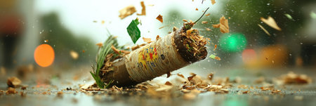 A firecracker detonates on an urban street, sending debris and leaves flying amidst a wet, overcast day.