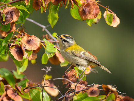 A bird singing from the branch. Nature with the copy space area. Common Firecrest, Regulus ignicapilla.