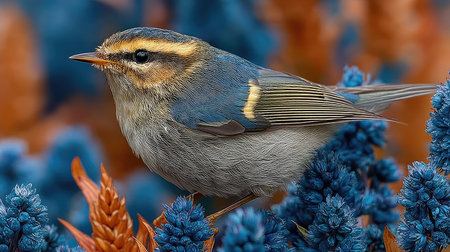 the goldcrest, europe's smallest bird, showcases its vibrant plumage and striking facial features in this stunning close-up portrait, captured in a surreal and artistic fashion photography style, highlighting the bird's intricate details and majestic beauty in a unique and captivating way. ai generated