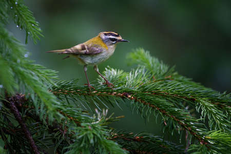goldcrest (Regulus regulus) among green branches of spruce, wild nature