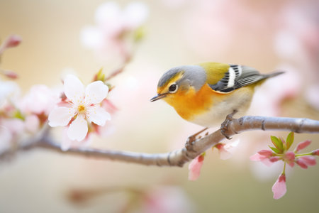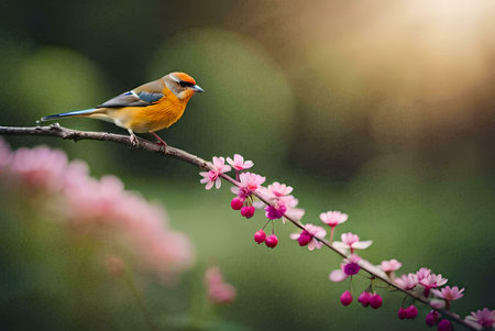 Elegant bird perched amongst vibrant pink cherry blossoms branch