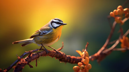 a small bird perches on a moss-covered branch in the norwegian wilderness, showcasing a beautiful blend of dark yellow and orange hues. the bird strikes a dignified pose, reminiscent of wimmelbilder and whistlerian art styles. this national geographic photo captures the essence of cranberrycore aesthetics in the midst of stunning norwegian nature. ai generated