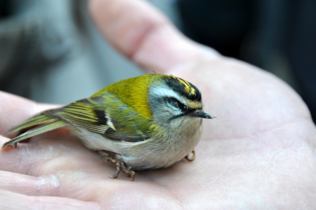 Top view of a goldcrest (Regulus regulus). Scientist holding it during a bird ringing session