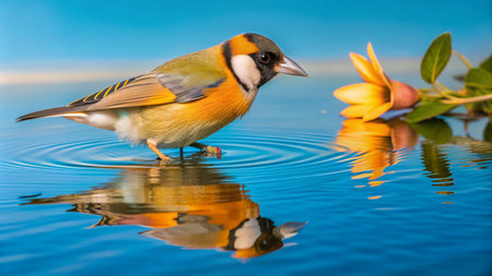 A small bird with orange and green plumage stands on a pond with its reflection visible in the water. A yellow flower floats in the background.