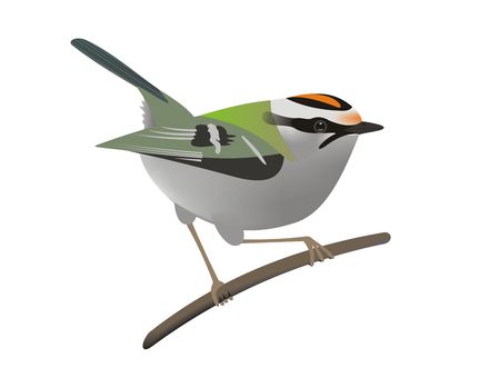 Illustration of a common firecrest (Regulus ignicapilla) with a white background.