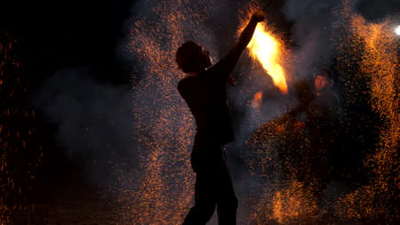 The guy turns a burning torch against the background of fire sparks. A lot of sparks fly in different directions. Fire show. Slow motion