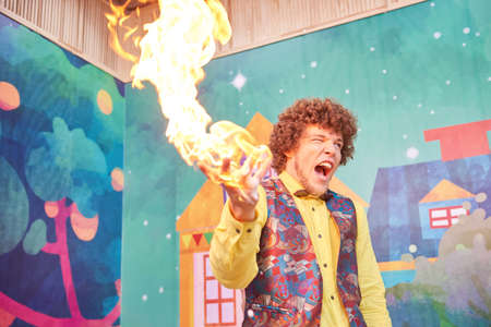 Kids fun on Birthday party. Smiling entertainer shows chemical trick - fire in palm.