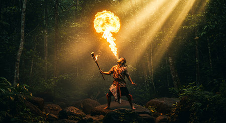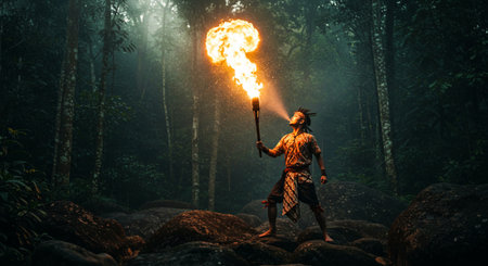 Ancient warrior with burning torch in the jungle of Borneo.