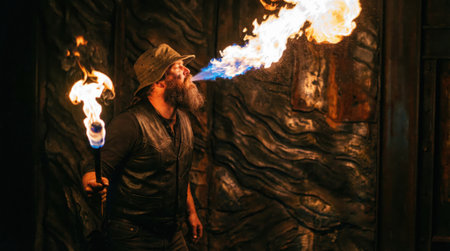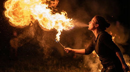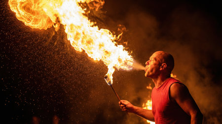A striking image showcasing a male fire performer expelling a large flame into the night backdrop, creating an intense, energetic, and captivating visual display of fire artistry. Perfect for entertainment or dramatic contexts.