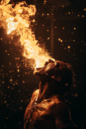 Fiery Performance Man Breathing Flames in Dark Background with Sparks.