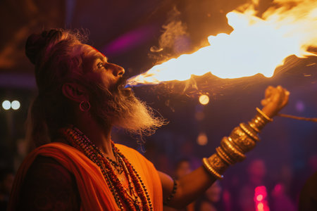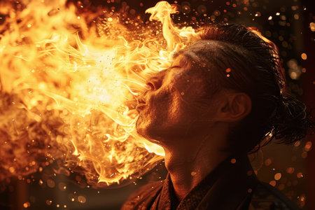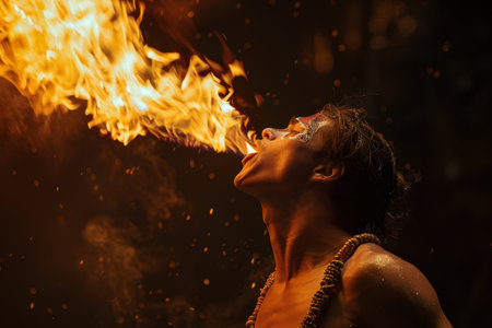 A fire eater bravely swallowing flames and breathing fire into the air mesmerizing the audience with daring feats of courage