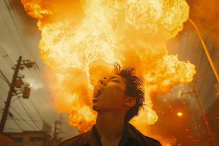 Fire breather performing a dangerous stunt with flames