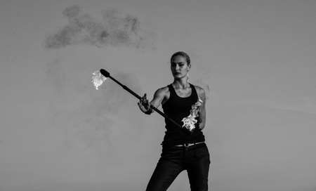 Hot and sexy. Sensual girl twirl fire baton. Pretty girl manipulate flaming rod outdoors. Female fire performer on blue sky. Baton twirling. Holiday celebration. Night party, copy space