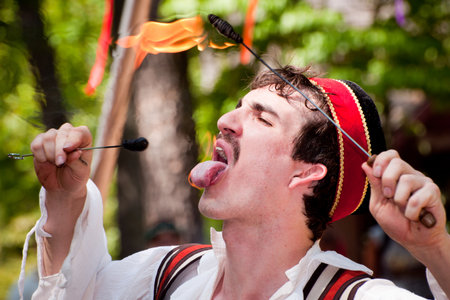 Atlanta, Georgia, USA - May 21, 2011 - A performer eats fire at the annual Renaissance Festival in Atlanta. The festival is a popular annual tourist attraction in the Southeast.