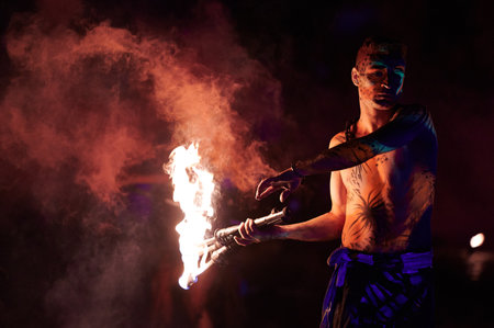 Male fire dancer holds a burning torch creating dramatic light and shadows during Los Fuegos Fire Theater in Poland, night horizontal shot with intense warm tones and focus on expression.