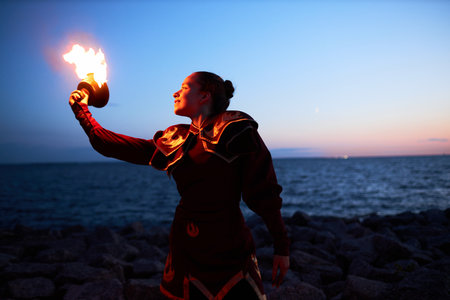Young woman breathes flame against tranquil ocean twilight. AI-generated.