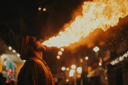 A skilled performer breathes fire during a nighttime festival in a vibrant city square. The illuminated crowd watches in awe as flames burst from his mouth, creating an exciting spectacle.