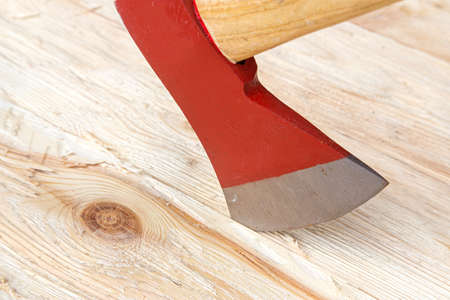 Lumberjack woodworking. Man with axe blade. Axe in man hand chopping wood. Cutting wood. Sharp blade. Lumberjack with axe in selective focus.