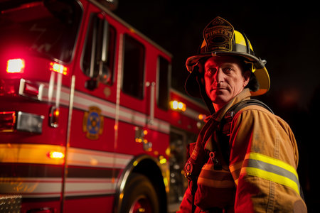 Epic portrait of firefighter stands ready amidst bright emergency lights, showcasing unwavering dedication to service. Generative AI