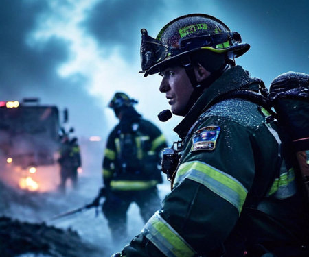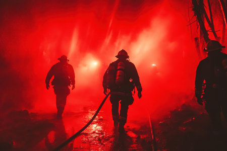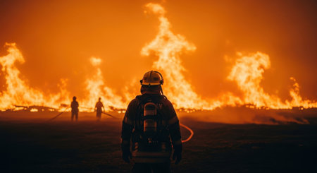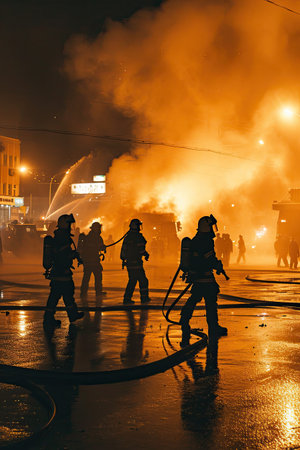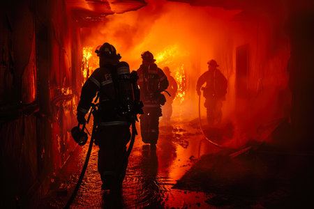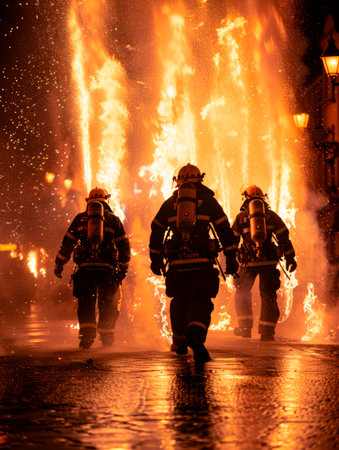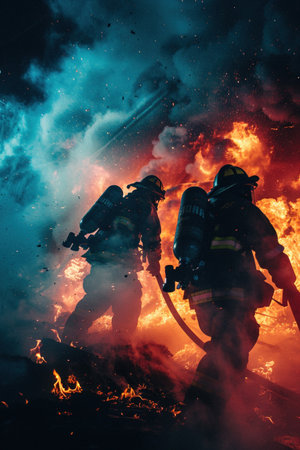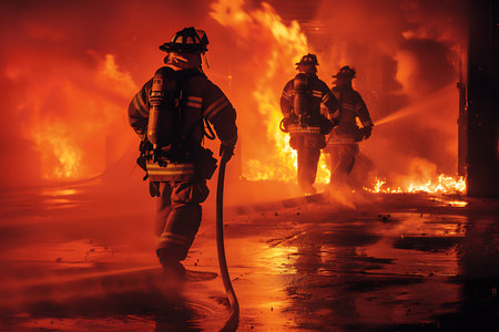 Firefighters battling blaze, intense flames, teamwork in action, heroic atmosphere