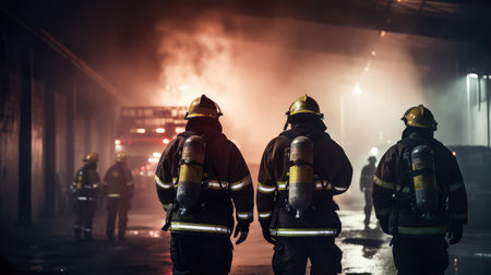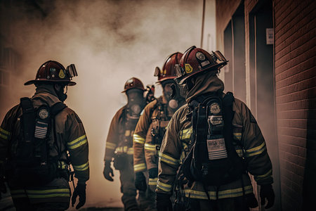 fire department, with firefighters in full gear and helmets preparing to enter burning building, created with generative ai