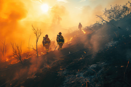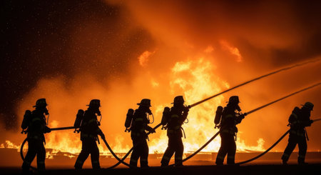 A group of firefighters, silhouetted against a fiery backdrop, are actively battling a large blaze. They are using hoses to douse the flames, demonstrating their bravery and dedication to controlling the fire. The scene captures the intensity and danger of their mission.