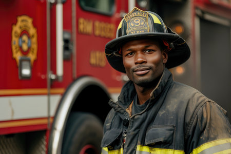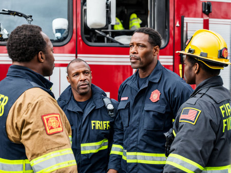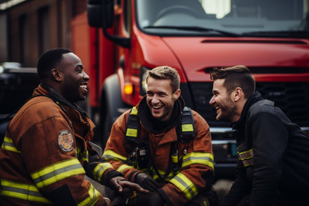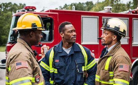 International Firefighters Day, an African American male firefighter talks with colleagues, the concept of dangerous and risky professions