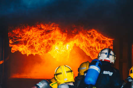 Firefighters extinguishing huge fire burning house industrial facility rescuing people fighting flames safety teamwork rescue spraying water firefighter service outdoors safety equipment protection