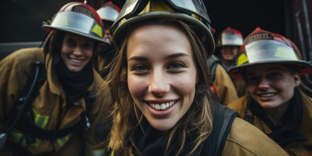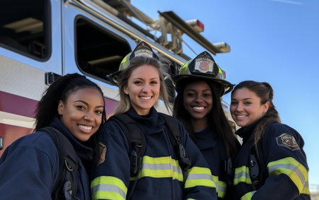 A group of female firefighters debriefing after a challenging rescue mission, their camaraderie and solidarity evident as they reflect on their experiences and support one another in processing the emotional toll of their work.