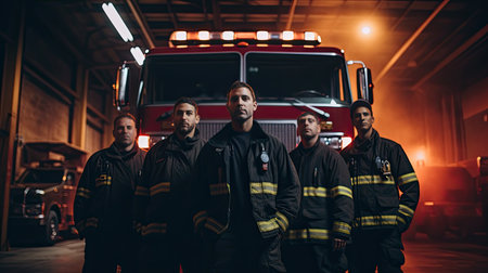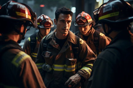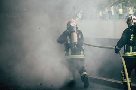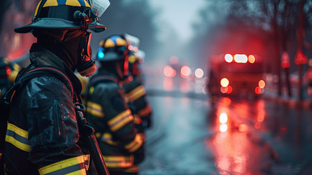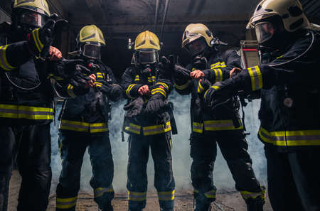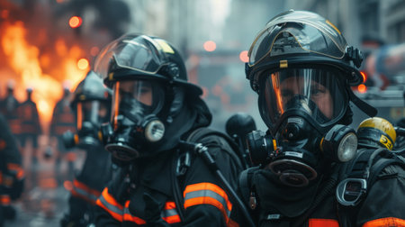 Group of fire men in protective uniform during fire fighting operation in the city streets, firefighters brigade with the fire engine truck vehicle in the background, emergency and rescue service